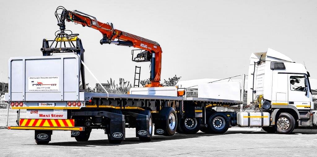 Semi-Trailer with an axle unit of three axles, two of which are steerable. Our Maxi-Steer trailer is engineered to carry a +/- 32 tonnes payload and boasts a unique steering system that reduces friction and aids in manoeuvrability on the road.